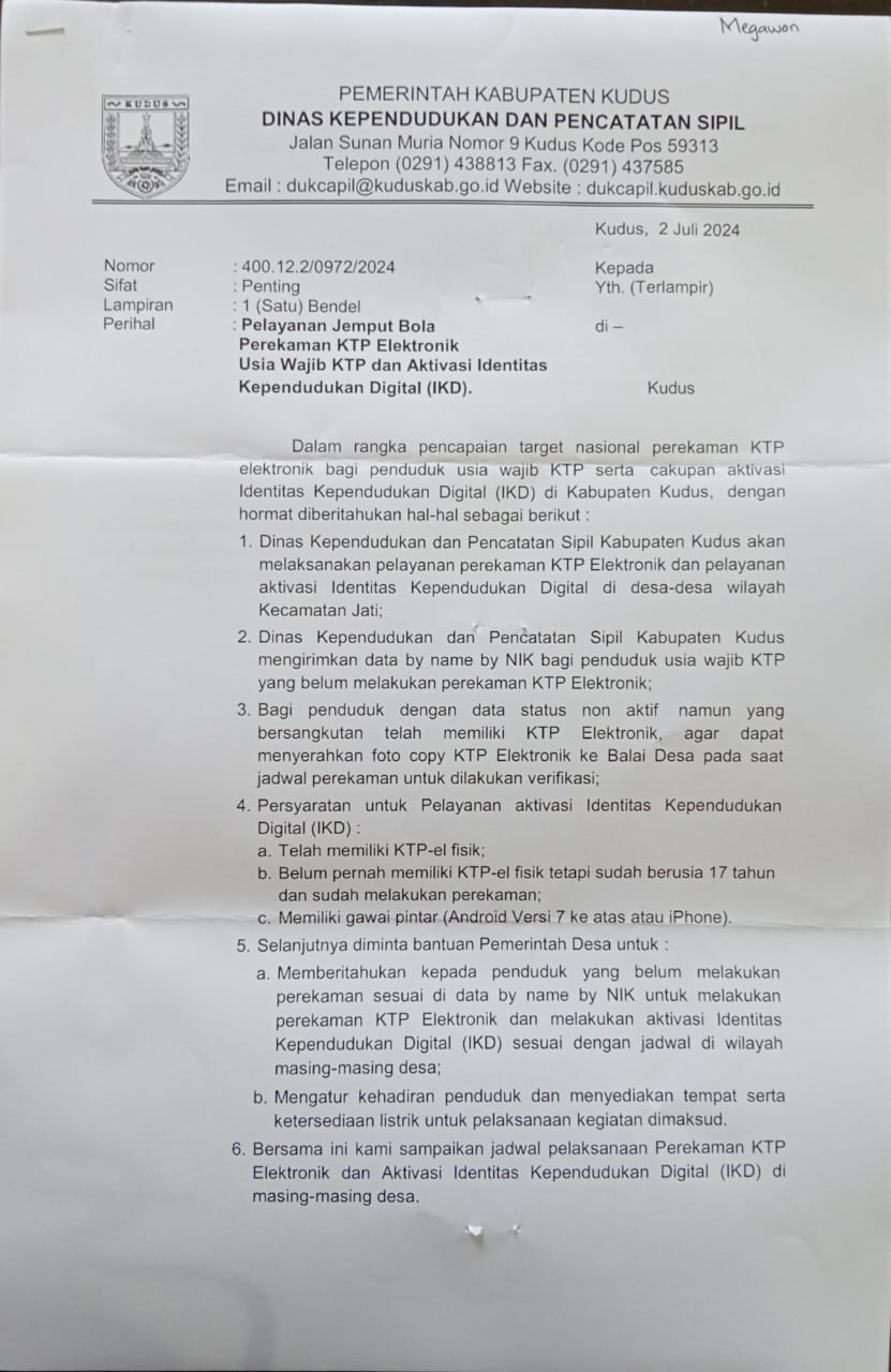 Untuk Pencapaian Target Nasional Perekaman KTP elektronik bagi penduduk usia wajib KTP serta cakupan aktgivasi Identitas Kependudukan Digital (IKD) di Kabupaten Kudus. Dinas Dukcapil akan melaksanakan pelayanan perekaman KTP di Desa Megawon pada tanggal 10-11 Juli 2024 jam 14.00-21.00 WIB. Tempat di Kantor Bale desa Megawon. Bagi nama warga yang namanya tercantum di Daftar Dukcapil harap bisa segera mengurus